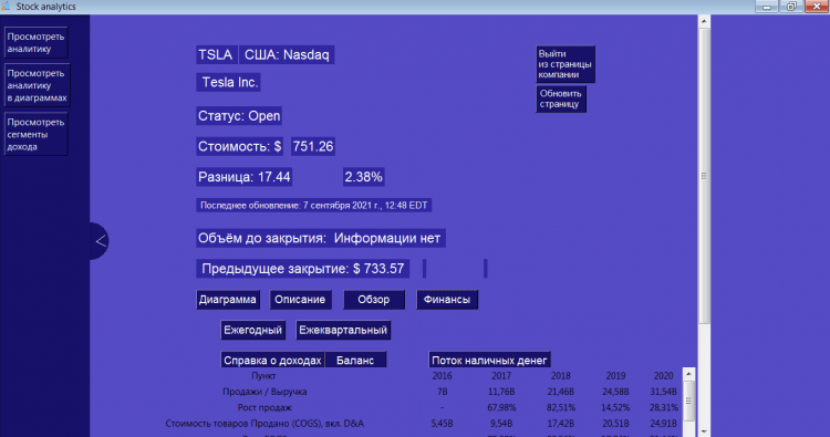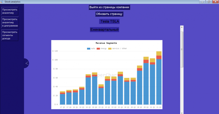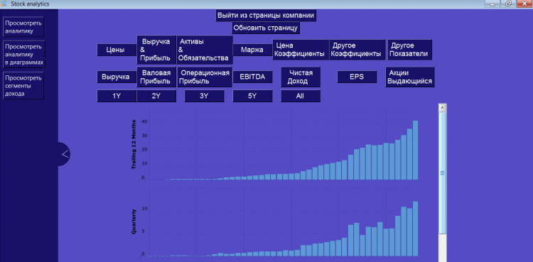 Поэтому мы разработали данное ПО которое заточено под поиск информации о компании и их акций. ПО агрегирует три сайта и берёт из них только нужную и полезную информацию. Здесь можно найти акции любых компаний, а к ним абсолютно все финансовые показатели среди них это может быть сегментация дохода компании и спрос по ним. Вся эта информация содержится как в графическом виде так и в текстовом.