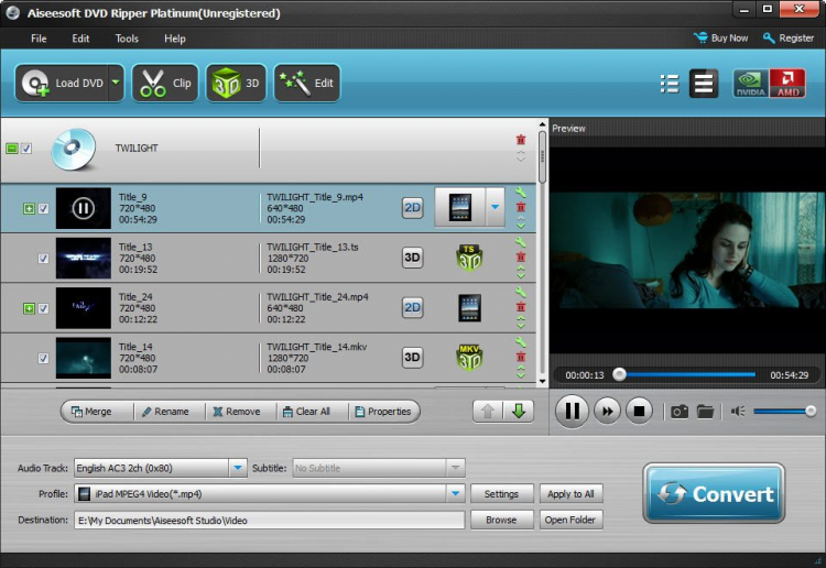 Aiseesoft DVD Ripper Platinum - это программа, которая поможет сделать рип DVD-диска в формате MP4, H.264, AVI, WMV, FLV, MKV, 3GP, VOB, DivX, MOV, DPG, HD H.264, HD AVI, HD MPG, HD TS, HD WMV, HD MPEG 4, HD MOV, HD ASF и др. С помощью этой программы вы сможете без труда скопировать DVD-фильм на PSP, iPod, iPhone, iPad, плееры Zune, Xbox, NDS и т.д. Aiseesoft DVD Ripper обладает широким набором функций, позволяющим обрезать видео, корректировать цвета, накладывать водяные знаки, резать и склеивать фрагменты видео и многое другое. Так же программа позволяет конвертировать обычные DVD-фильмы в 3D.