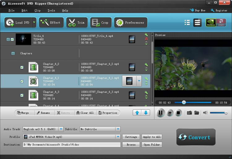 С помощью этой программы вы сможете без труда скопировать DVD-фильм на PSP, iPod, iPhone, iPad, плееры Zune, Xbox, NDS и т.д. Aiseesoft DVD Ripper обладает широким набором функций, позволяющим обрезать видео, корректировать цвета, накладывать водяные знаки, резать и склеивать фрагменты видео и многое другое.