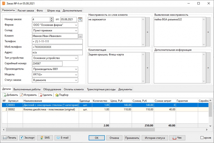 - Прием заявок на ремонт оборудования. Данные заносятся в список заказов, в котором есть поля для просмотра и сортировки информации: клиента; число, когда оборудование было принято в сервисный центр; статус заказча и срочность работы; вид поломки; планируемые мероприятия по ремонту и многие другие, важные данные.