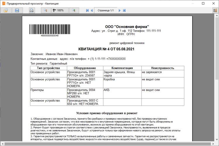 - Печать документов. В приложении уже есть готовые шаблоны гарантийных талонов, квитанций и актов. Достаточно заполнить нужные поля и распечатать требуемый документ.