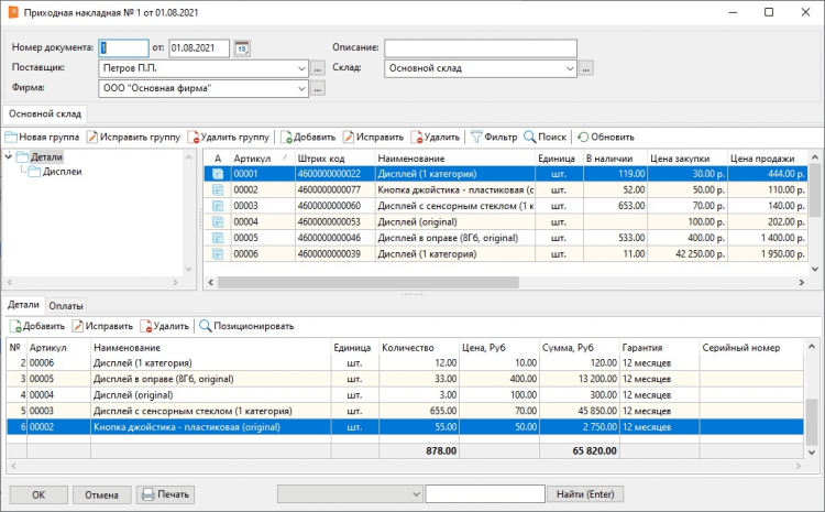 - Вести учет деталей и комплектующих, находящихся на складе. Также контролировать поступление и расход.