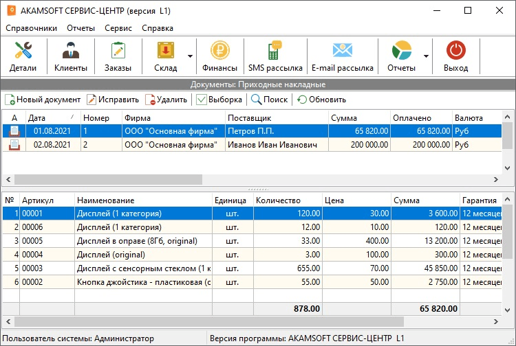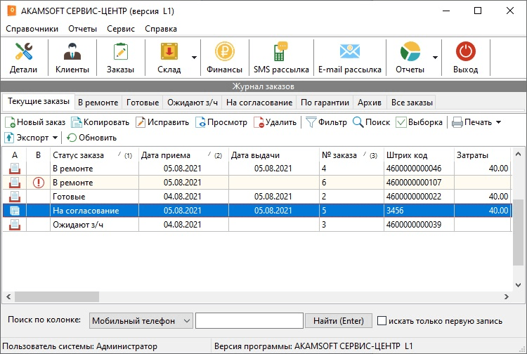 AKAMSOFT СЕРВИС-ЦЕНТР — программа для сервисного центра разработчика Akamsoft предназначена для учета заказов по ремонту в сервисном-центре. Она позволяет вести журнал заказов по приему техники в ремонт, выписывать квитанцию и акт выполненных работ. Имеет возможность настройки печатных форм. Показывает отчет по ремонту за период по клиентам и мастерам, расчету прибыли при учете стоимости затрат на ремонт.