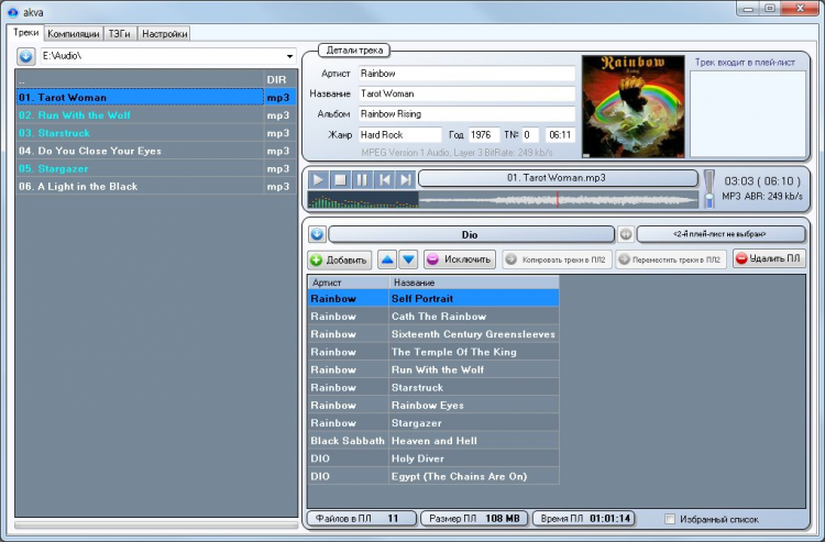 Akva - это аудио плеер, менеджер плей-листов. Конвертирование, переименование файлов, редактирование тэгов. Основное назначение программы составление плей-листов и подготовка к записи составленных компиляций на носитель (например, для автомобиля или флеш-плеера). Поддерживает основные типы аудиофайлов (mp3, wma, ape, flac и др.).