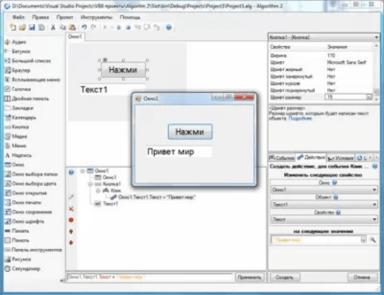 Алгоритм - это обновленная версия программы, которая предназначена для создания своих игр, программ и приложений. Благодаря своей легкости и многофункциональности, программа будет полезна для пользователей всех возрастных групп. Современные программные объекты помогут создать свои плеера, браузеры, текстовые редакторы, работать с файлами и папками, экраном компьютера, реестром, управлять мышкой и клавиатурой. Несмотря на свою многофункциональность, программа легкая в работе. Свою созданную программу можно сразу сохранить в exe-файле.