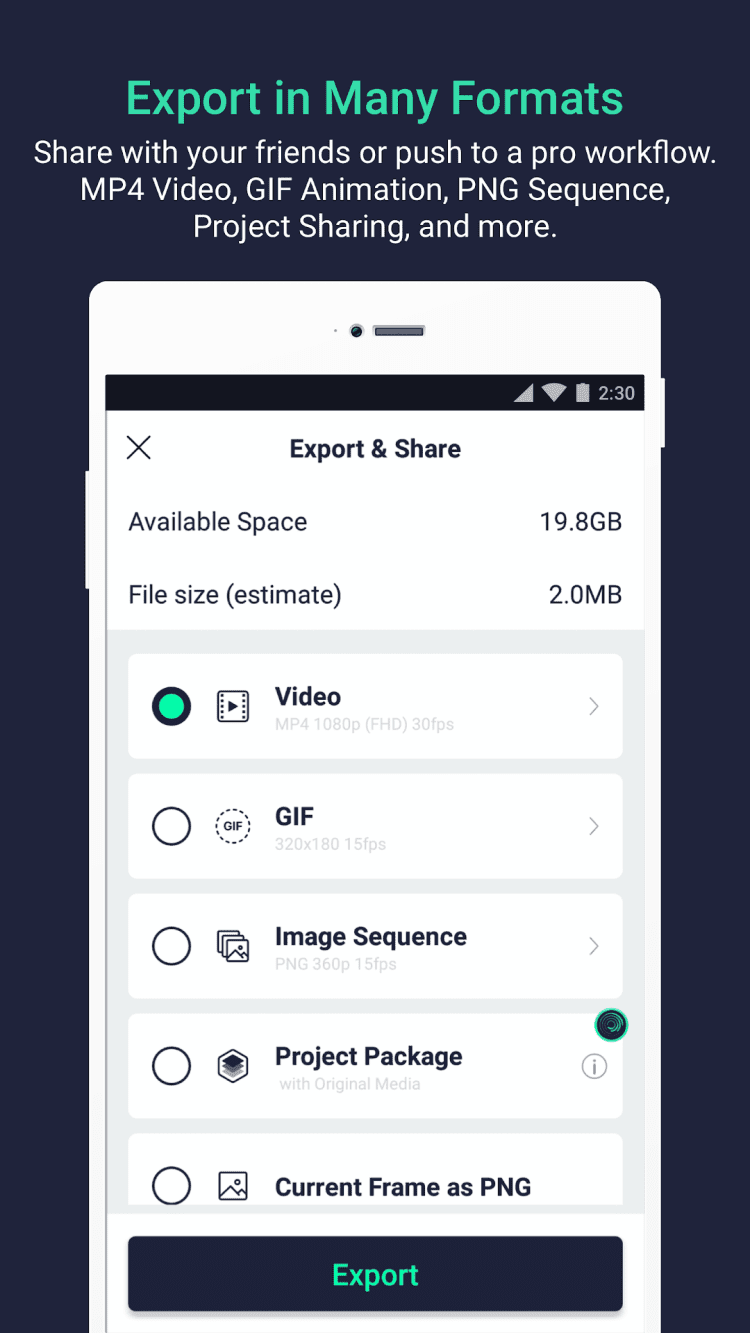 - возможность экспорта видео в формате MP4 и анимаций GIF.