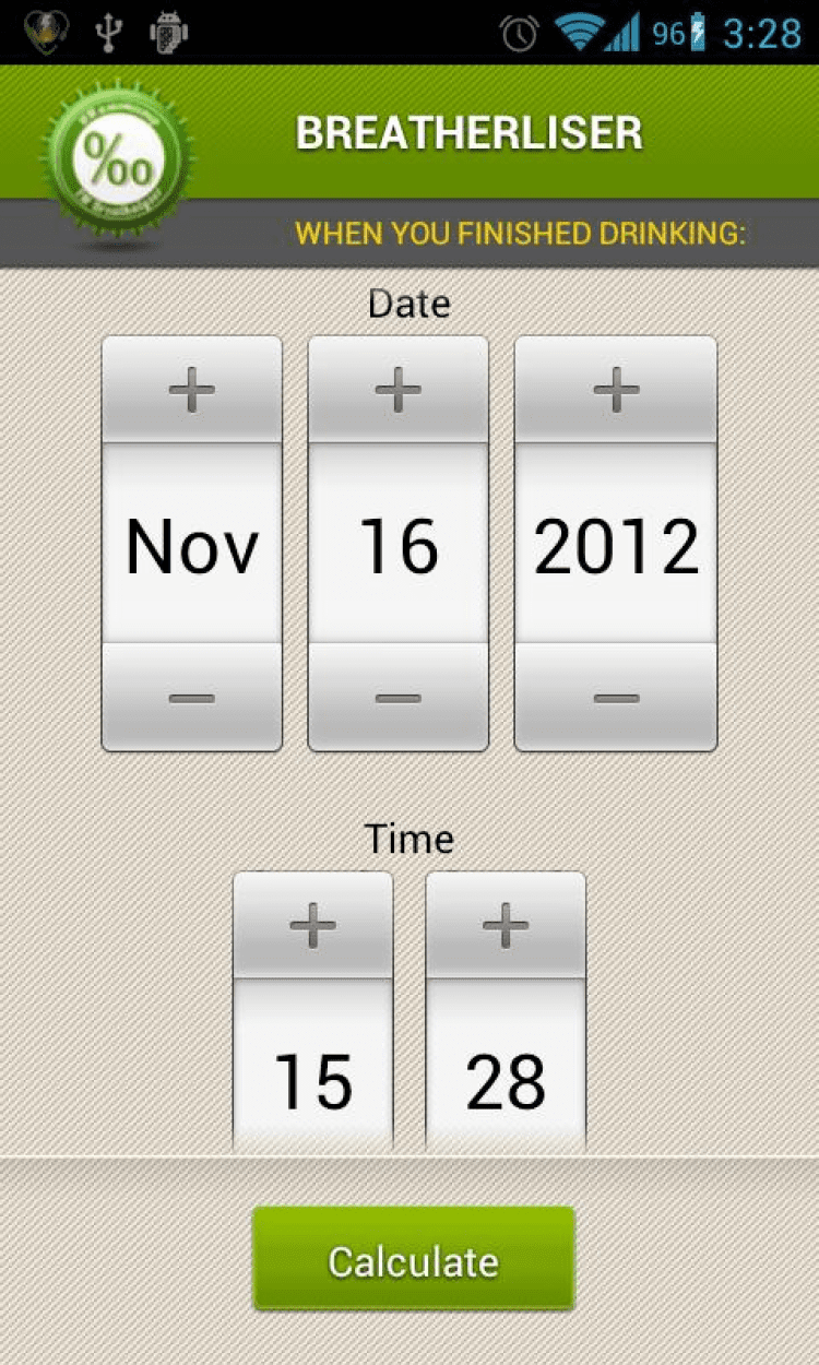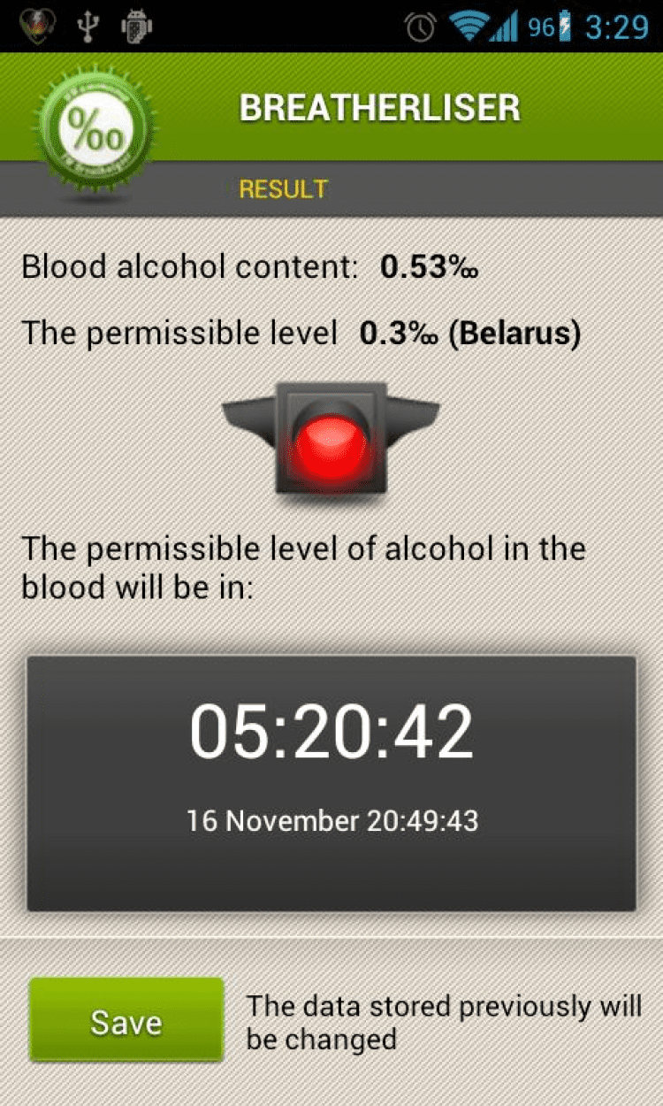 Если в какой-то момент алкотестер показал уровень алкоголя в крови, не позволяющий управлять транспортным автосредством, вы можете выбрать опцию "Разбудить меня" и приложение попытается уведомить/разбудить вас, когда уровень алкоголя в крови станет допустимым.