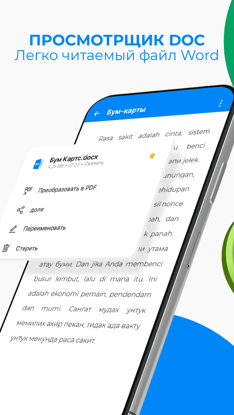 - просмотр текстовых файлов doc, docx, docs, odt, txt;