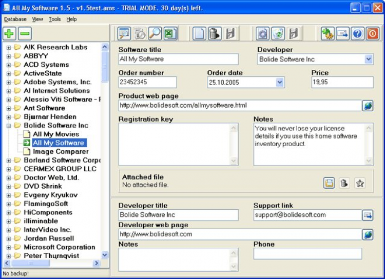 Вы никогда не потеряете ваши регистрационные ключи, если вы используете наш персональный каталог программ All My Software™. С гибким графиком напоминания о резервном копировании All My Software™ будет надёжно хранить регистрационную информацию неограниченного числа программных продуктов. Вся ваша регистрационная информация вместе с контактными данными разработчиков всегда будет легко доступна и её не придётся искать часами.