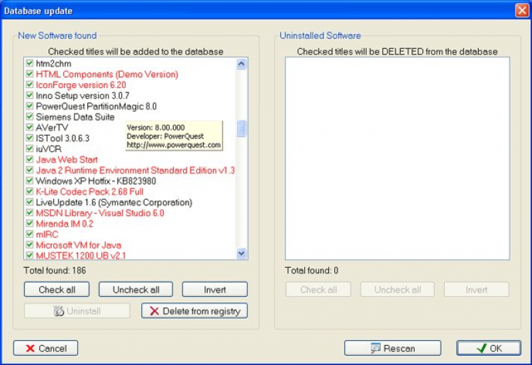 - Автоматический поиск установленных/деинсталлированных программных продуктов.