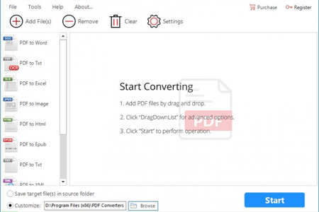 All PDF Converter - это универсальный конвертер PDF файлов для Windows. С его помощью можно выполнять конвертирование документов в такие форматы как doc, docx, xls, xlsx, pptx, Epbu, Txt, Html, jpg, png, bmp, Tiff, EMFF и XML. Он может конвертировать PDF файлы "пачками" экономя время, и сохраняет оригинальное форматирование и верстку документов.