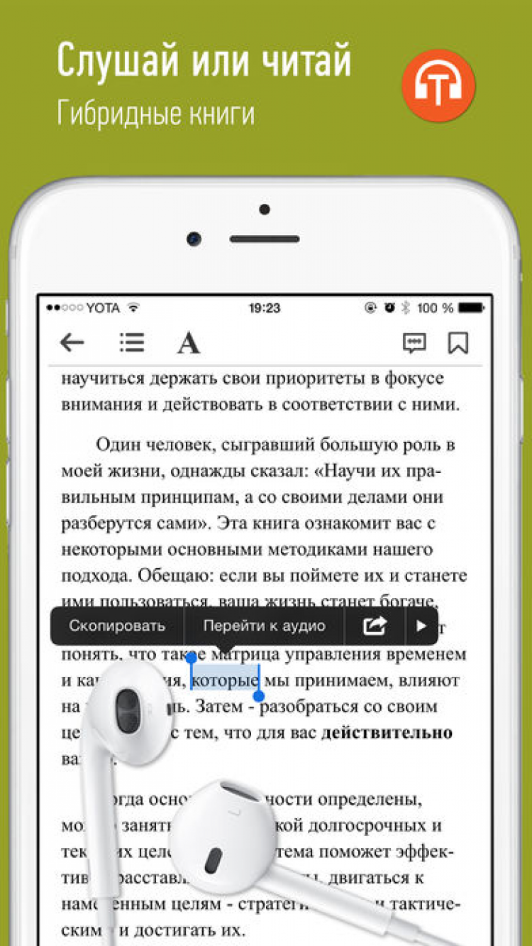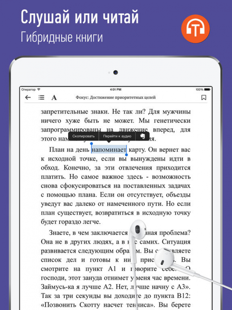 - чтение и прослушивание книг, синхронизированных с аудиоверсией