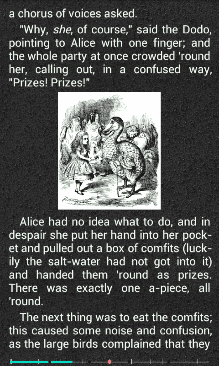 Полезной особенностью AlReader является функция быстрого перехода по тексту. Переходите на 10 страниц назад и вперед, переключайтесь на следующую или предыдущую главу, а также в начало или конец текста.