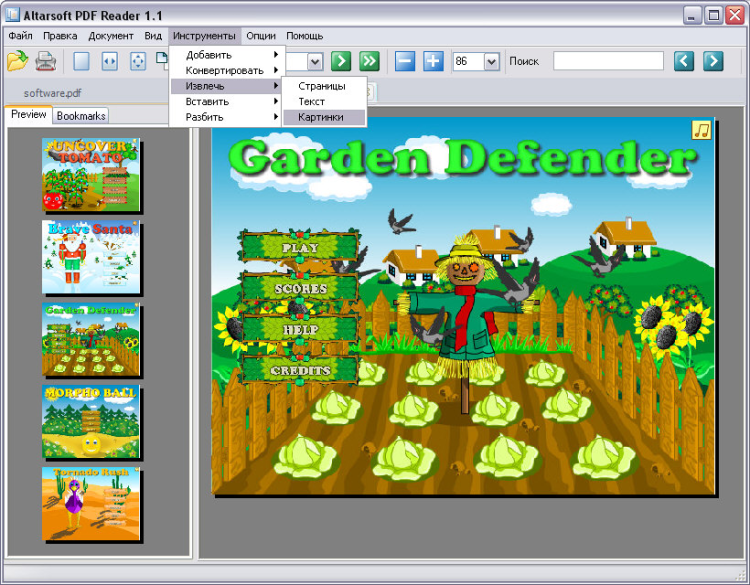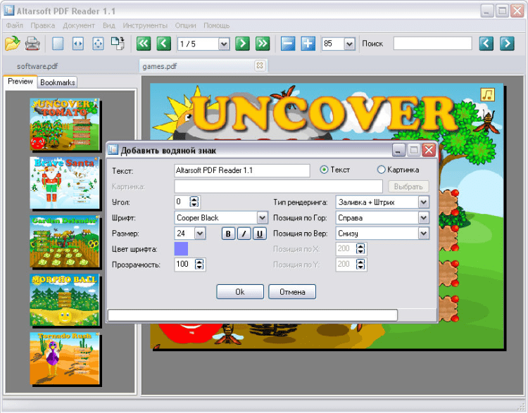Altarsoft PDF Reader — это программа для просмотра и редактирования PDF файлов. Основные возможности программы: чтение / запись pdf файлов, изменение масштаба, вращение, защита, добавление аннотаций, добавление закладок, добавление водяных знаков, добавление приложений, слияние документов, вставка чистых страниц, вставка страниц из файлов, вставка текста из файлов, извлечение страниц в pdf файл, извлечение страниц в jpg картинки, извлечение страниц в текстовый файл.