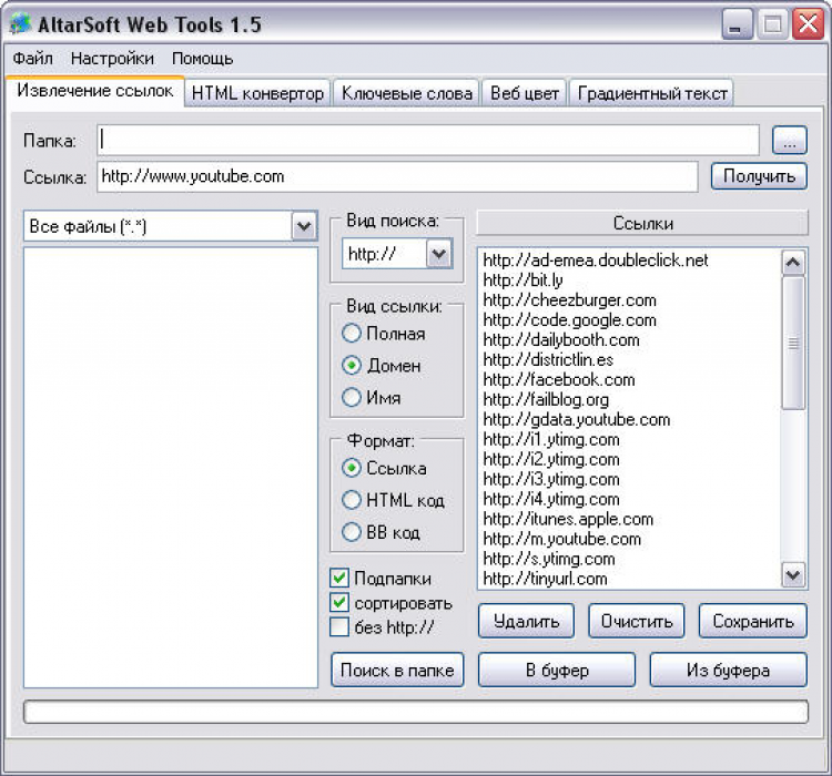 Программа может извлекать полный url, домен или имя файла. Можно указать формат ссылки: ссылка, html код, bb код. Найденные ссылки можно сохранить в HTML, текстовом формате или скопировать в буфер. Html конвертор позволит вам выбрать текст из веб-страниц, а также автоматизировать процесс создания html файлов из текстовых файлов. В программе можно регулировать длину строки создаваемого текстового файла. Программа также позволяет искать ключевые слова в тексте и создает страничку с ними.