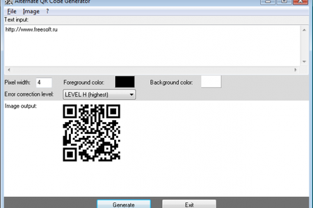 Alternate QR Code Generator Простая в использовании программа-генератор QR-кодов. С его помощью можно создать QR-код, который будет содержать ссылку на ваш сайт, ваши контактные данные, или любую другую текстовую информацию. Alternate QR Code Generator позволяет выбрать уровень коррекции ошибок, толщину линий, цвет фона и QR-кода.