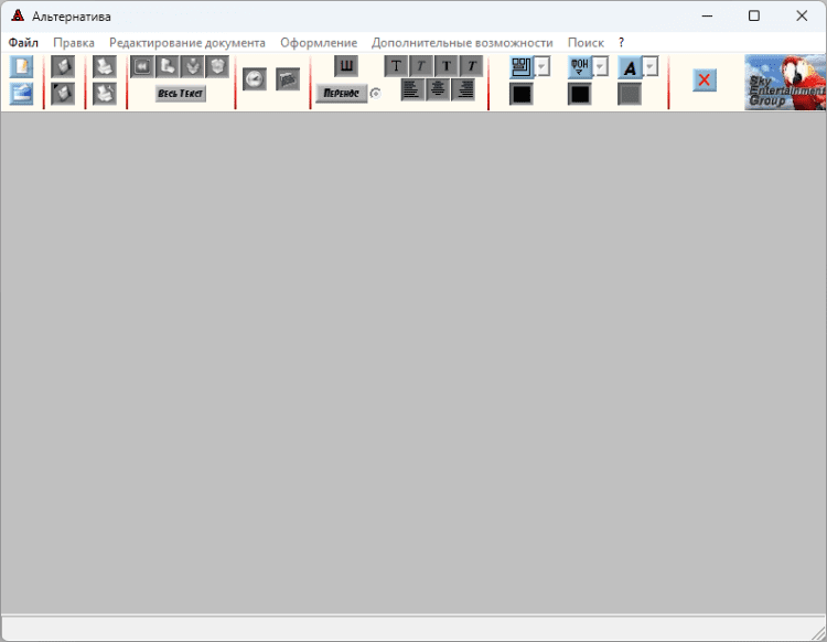 Альтернатива — это программа, которая представляет собой альтернативу текстовому редактору WordPad. Имеется поддержка форматированного текста. Программа почти полностью дублирует основные возможности редактора от Microsoft. Главной особенностью программы является очень стильный интерфейс. Первый проект Sky Ent. Group.