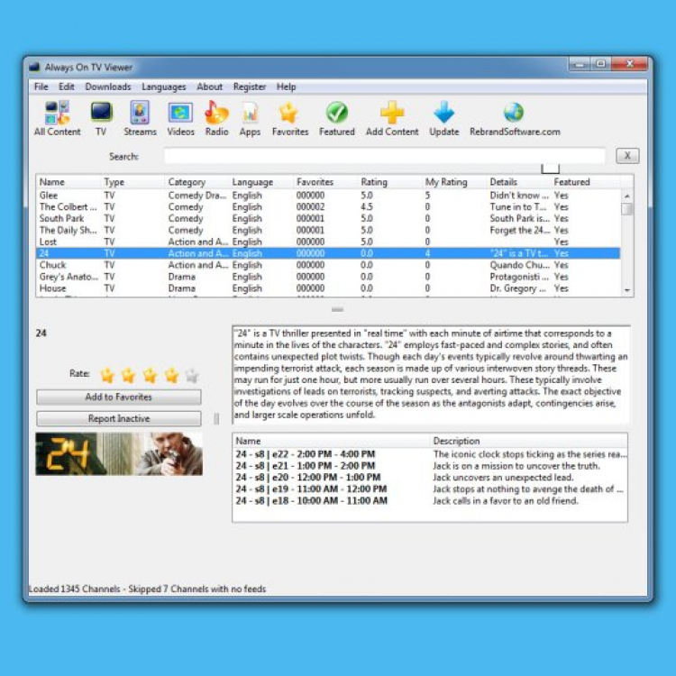 Always On TV Viewer - это программа, созданная специально для любителей ТВ-сериалов и передач, фильмов и пр. Она открывает онлайн доступ к целым сезонам сериалов, фильмов, который транслируются в интернете. Пользователи могут почитать описание сериала/фильма, посмотреть рейтинги, узнать время трансляции и, конечно, посмотреть видео.