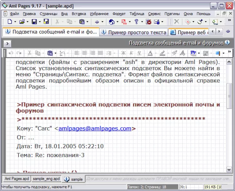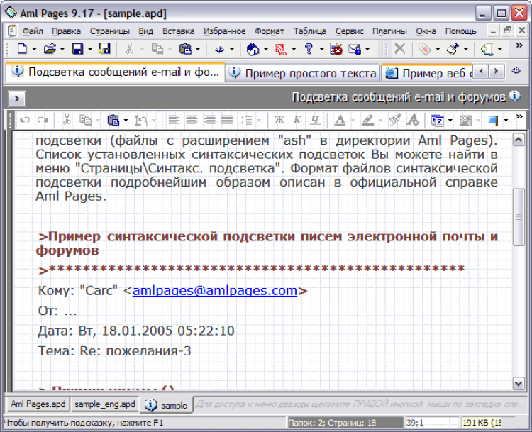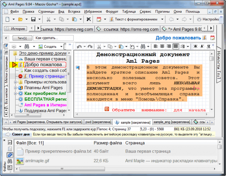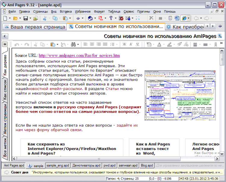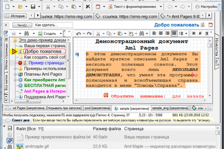 Aml Pages - это электронная записная книжка, оперативный блокнот на все случаи жизни. Она позволяет хранить самую различную информацию: личные записки, e-mails, картинки, фрагменты веб страниц, URL, документы, пароли. Обладает развитым текстовым редактором с поддержкой форматирования, вставкой таблиц и изображений, удобными стилями форматирования и закладками (bookmakrs) на фрагменты текста. Информация представляется в виде тематического дерева разделов. Быстрый поиск "примерно" - "на глазок" - находит нужные записи практически мгновенно. Но можно использовать и мощный полнофункциональный поиск с массой настроек и выбором областей документа.