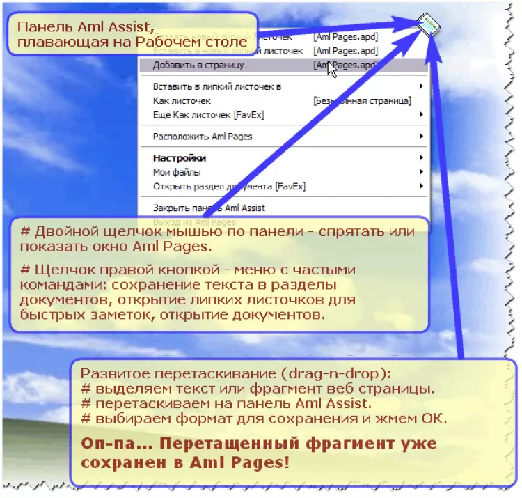Панель вкладок позволяет мгновенно переходить к часто используемым разделам. Хранимые данные могут быть защищены паролем пользователя. С помощью панели Aml Assist можно легко управлять окном программы, а перетаскиванием мышью сохранять тексты и веб страницы из почти всех популярных программ: MS Office и OpenOffice.org, Outlook и The Bat, всех популярных веб браузеров - Internet Explorer, Firefox, Opera, Safari, Maxthon, Google Chrome.