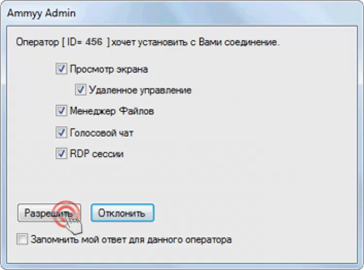 - Разрешает подключение к удаленному ПК по паролю, по ID или по согласию пользователя.