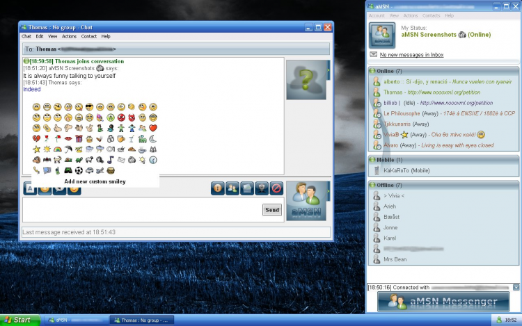 aMSN - это хорошая альтернатива Microsoft Messenger с поддрежкой веб-камеры. В ней добавлены такие функции как: уведомление о событиях, конференц-связь и автосмена статуса при долго отсутствии. Так же вы сможете передавать файлы и сортировать контакты по группам.