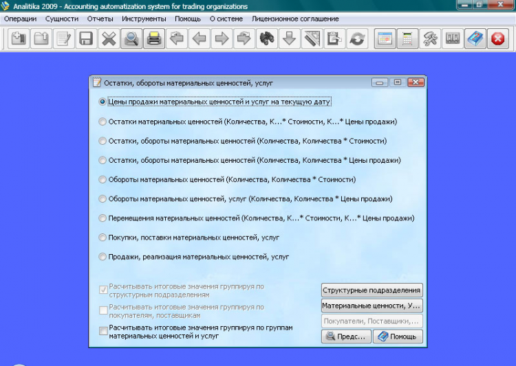 - остатки и обороты товаров, материальных ценностей, услуг (количества, суммарные значения как по ценам продажи так и по себестоимости) по складам, магазинам, торговым точкам;