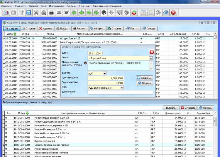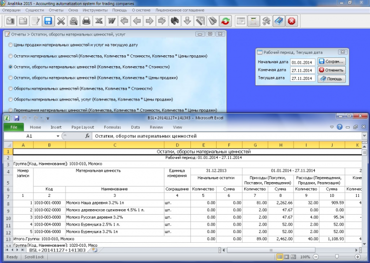 Добавлена возможность импорта данных из Microsoft Excel файла в базу данных. Теперь пользователю не придется вручную заполнять справочники: Материальные ценности, Услуги; Цены продажи; операции: Первоначальные остатки товаров в отделах компании; Покупки, поставки; Перемещения из склада в магазин или обратно; Продажи, если эта информация уже имеется в каком-либо электронном формате. Достаточно ее конвертировать в файл Microsoft Excel и одним нажатием клавиши импортировать в базу данных. Эта функция экономит массу времени как на начальном этапе работы с программой, когда нужно формировать справочники и вводить первоначальные остатки, так и облегчает текущую работу, если хотя бы какая то часть из выше перечисленной информации предоставляется пользователю в электронном формате. Так, например, эта функция будет удобна при изменении цен продажи на большое количество товаров. Ведь гораздо удобнее сформировать прайс-лист новых цен продажи на товары в MS Excel файле, а потом одним нажатием клавиши, быстренько, ввести новые цены в базу данных.