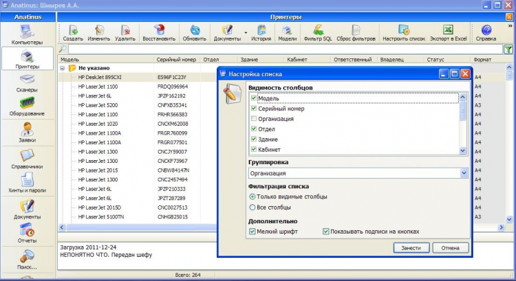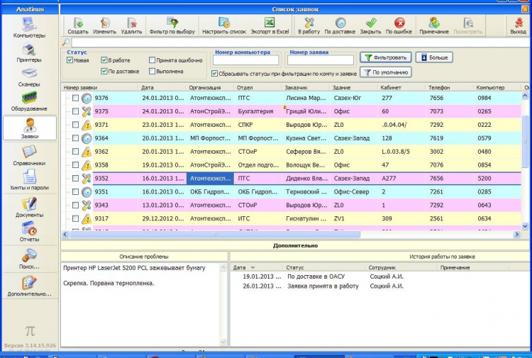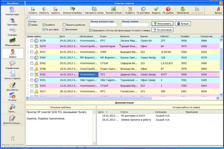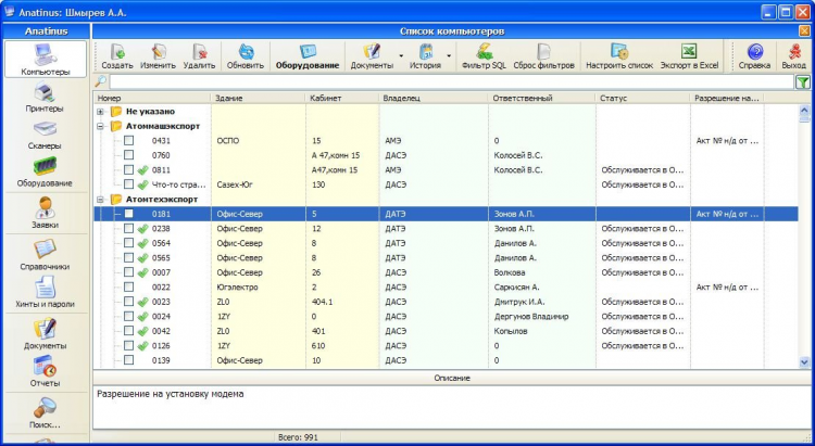 Anatinus - это программа для учета оборудования в фирме и контроля перемещения оборудования и комплектующих. Учет прихода комлектухи, введения в эксплуатацию и поддержки компьютеров, принтеров и сканеров. Учет заявок на ремонт и контроль их выполнения. Демо-версия, с некоторыми ограничениями. Работает под MS SQL 2008 (возможно, пойдет и на 2005, не проверял). Проверена в работе на Бушерской АЭС (более 1000 компов, около 250 принтеров, около 50 сканеров). Работает три года без нареканий. Примечание. Программа расчитана на наименования компьютеров строго по номерам (0001, 0002, 1024 и т.д.) Чуть позже будет фикс. По всем вопросам - пишите на [email protected] Логин/пароль для входа в программу - Del/111