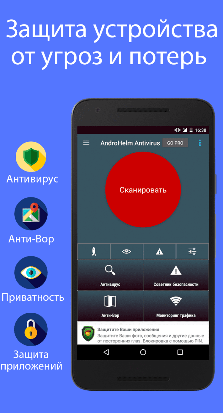 AndroHelm Antivirus — программа, способная защитить ваш смартфон или планшет от всех видов угроз. Она предоставляет надежную защиту в режиме реального времени, а так же позволит производить проверку устройства в любой момент. Так же она будет автоматически проверять приложения сразу после их установки.