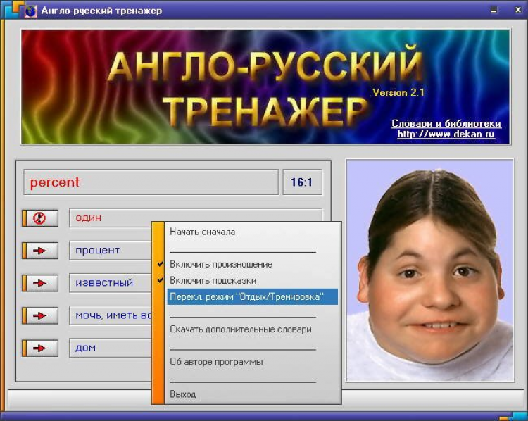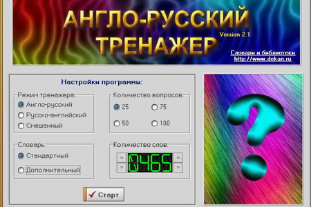 Англо-русский тренажер - это увлекательное изучение технического английского языка. Компьютер-"преподаватель" всегда по-разному (в том числе, на молодежном "сленге") реагирует на Ваши действия. Смешные физиономии помогут Вам расслабиться и представить, что ЭТО - ВЫ... :-) Поиск "маленьких секретиков" в программе позволяет продлить интерес к изучению иностранного языка. Ну а если Вы все же захотели отдохнуть - почитайте законы Мерфи... Набор английских слов стандартного словаря представляет собой так называемый компьютерный Basic-English.