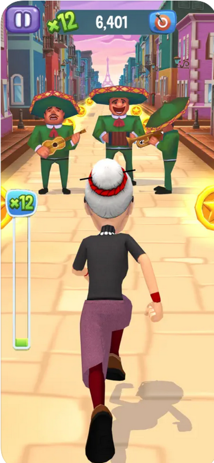 Яркая и красочная игра, в которой вам предстоит помочь старушке пробежать как можно дальше по различным городам мира, избегая препятствий. Программа обладает яркой графикой, простым управлением и весёлой атмосферой, которая никого не оставит равнодушным.