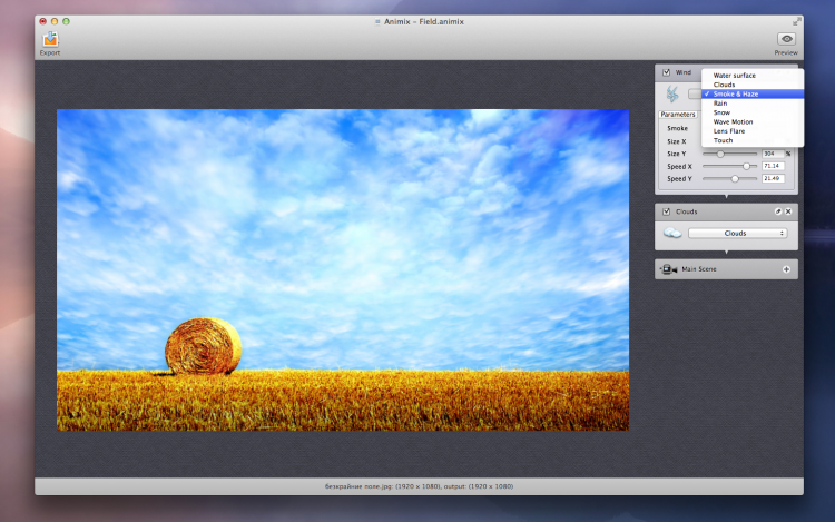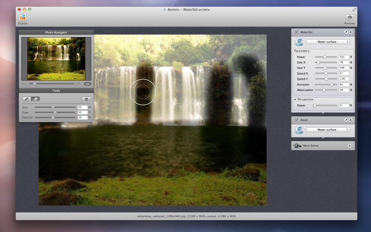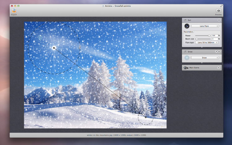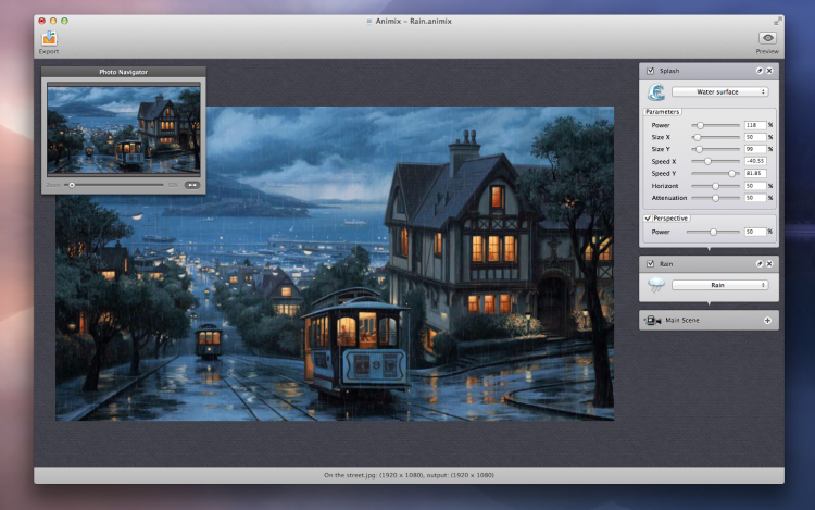 Animix Отличный способ вдохнуть жизнь в неподвижную фотографию. С помощью Animix можно добавить погодные эффекты, анимировать водую гладь, добавить солнечные блики или создать эффект движения камеры. Не смотря на сложность этих эффектов, программа очень просто, так что с ней справится даже ребенок. Созданные результаты можно эфкспортировать в качестве QuickTime-фильма или же как самостоятельный скринсейрвер.