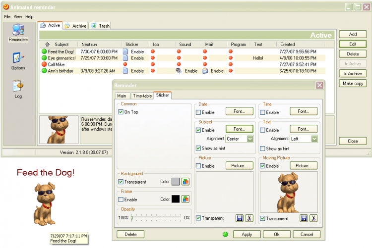 AniReminder - это программа-напоминалка, которая не даст забыть о запланированных делах или назначенной встрече. Предлагает различные варианты аудио и визуальных напоминаний. Так же может отправлять "напоминалки" по электронной почте на указанный адрес и открывать в нужное время определенный файл(DOC, TXT и др.).