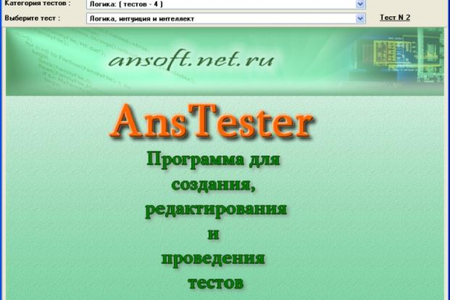 AnsTester - это программа для составления любых тестов, включая т.н. психологические, с начислением баллов за каждый ответ, также с помощью программы можно проводить опросы. Легко устанавливается в компьютерном классе. Легкость и быстрота создания тестов. И вопросы и ответы могут содержать форматированный (разного цвета и размера шрифта) текст и небольшие рисунки. Содержит пошаговые инструкции по созданию теста и установке в компьютерном классе.