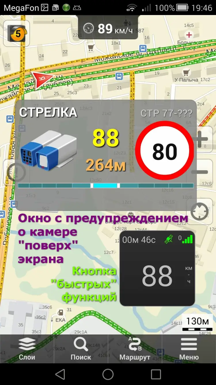 Приложение Антирадар Стрелка позволяет определять всевозможные объекты на дороге, в том числе стационарные камеры, стралки, посты ДПС, полосы для общественного транспорта, а также нестационарные и собственные точки: засады, переезды, лежачие полицейские, тоннели и прочие опасности. На всплывающем окне вы увидите тип объекта, расстояние до него, ограничение скорости и вашу текущую скорость.