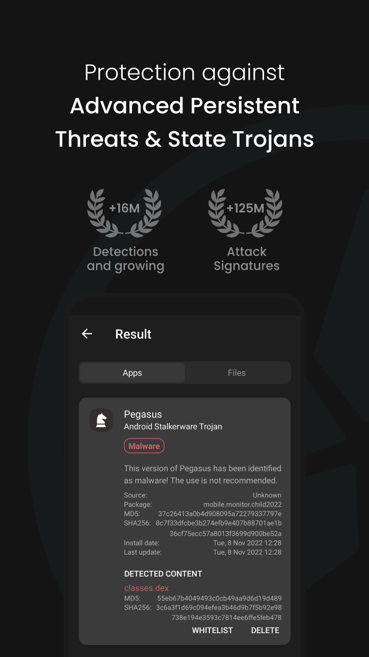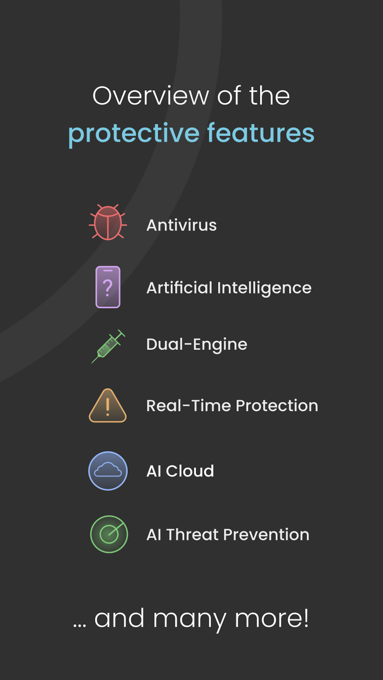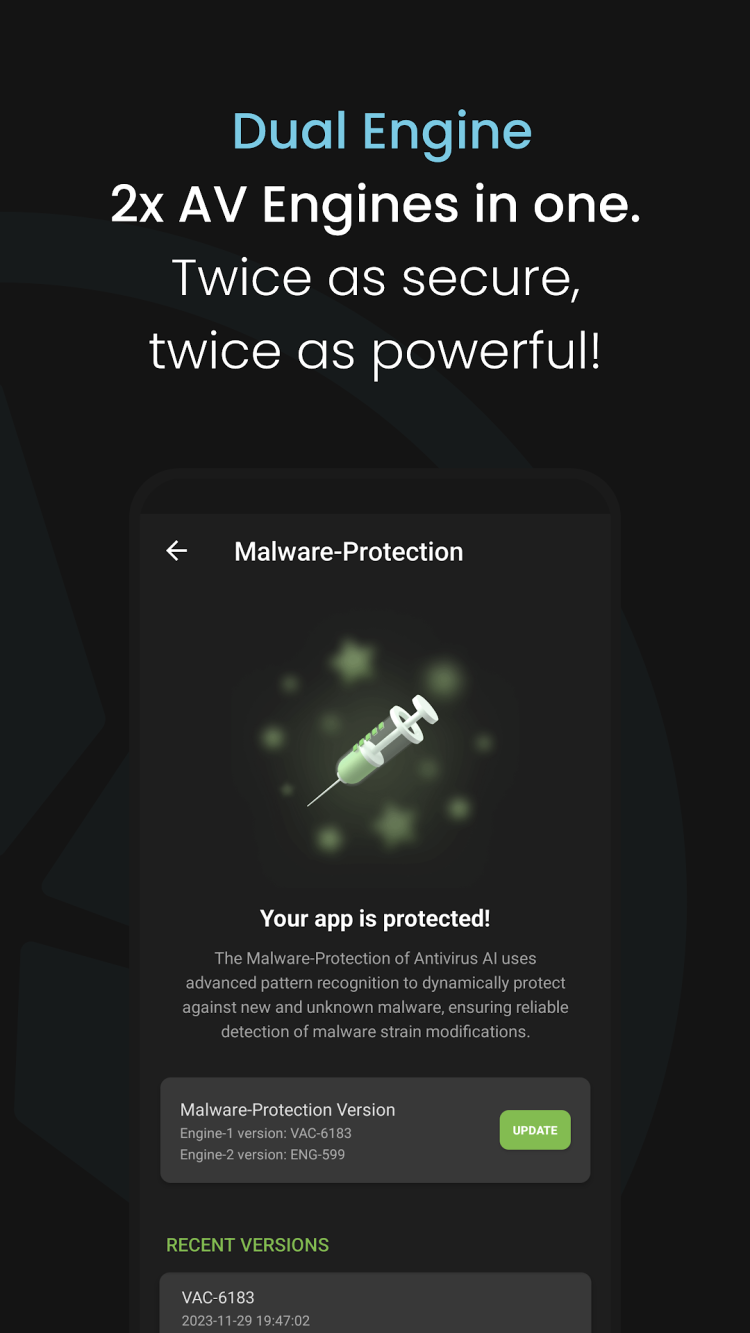 Каждое приложение и файл, хранящиеся на вашем устройстве, рассматриваются с разных сторон для лучшего обнаружения вредоносного кода. А для обеспечения еще лучшей защиты, последняя версия приложения Antivirus AI использует два антивирусных сканера вместо одного.