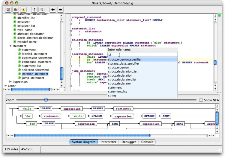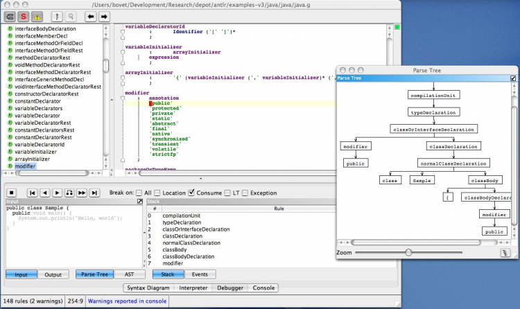 ANTLR Генератор парсеров, позволяющий автоматически создавать программу-парсер на одном из целевых языков программирования (C++, Java, C#, Python, Ruby). Позволяет конструировать компиляторы, интерпретаторы, трансляторы с различных формальных языков. Предоставляет удобные средства для восстановления после ошибок и сообщения о них.