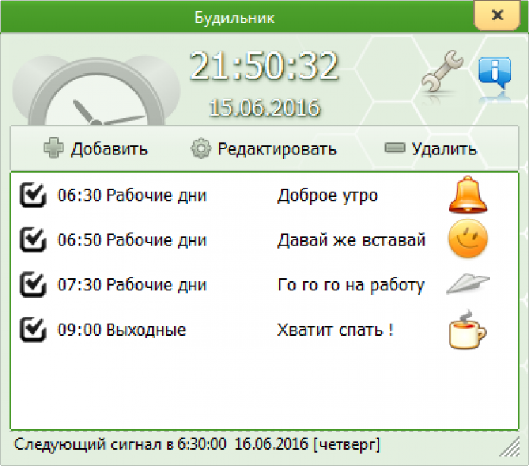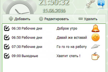 Вы можете установить время и выбранную мелодию на любой день недели. Возможность запрограммировать время пробуждения на полную рабочую неделю просто бесценно для тех, кто периодически забывает завести будильник. Забавные картинки и возможность отправить самому себе или любимому человеку послание делают эту программку уникальной и интересной.