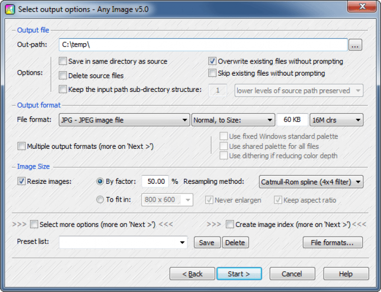 - конвертирование изображений сразу в несколько разных форматов;