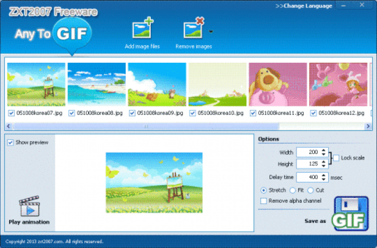 Any To GIF позволяет из нескольких изображений создавать один анимированный GIF файл. Поддерживает форматы BMP, WBMP, JPEG, PNG, TIF, GIF, PSD, ICO, PCX, TGA, JP2. Обладает простым и интуитивно понятным интерфейсом.