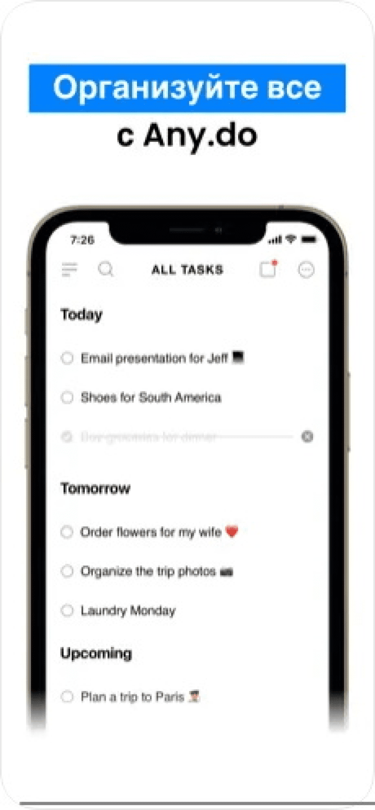 С этим приложением вы никогда не забудете о намеченных планах. С Any.DO управлять своими делами станет просто как никогда. Перетаскивайте задачи чтобы организовать их, зачеркивайте выполненные, а чтобы удалить выполненные задачи, просто потрясите устройство.