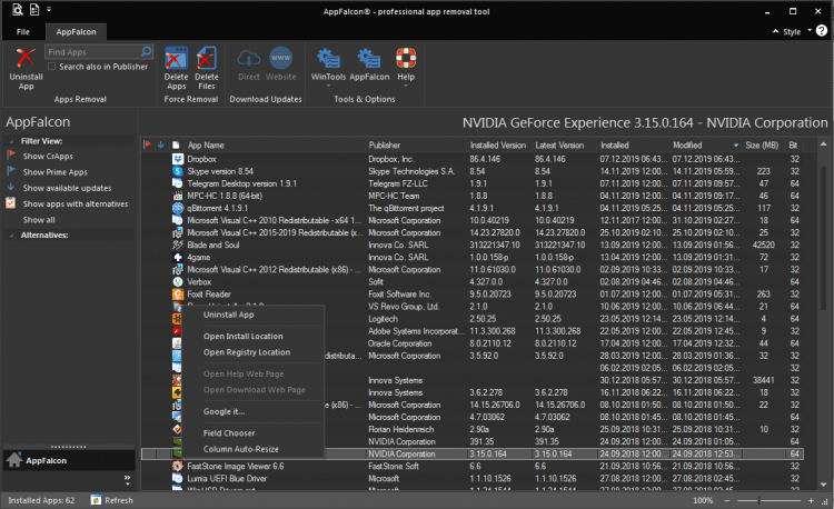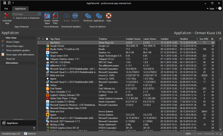 AppFalcon это программа для Windows, специализирующаяся на удалении других программ.