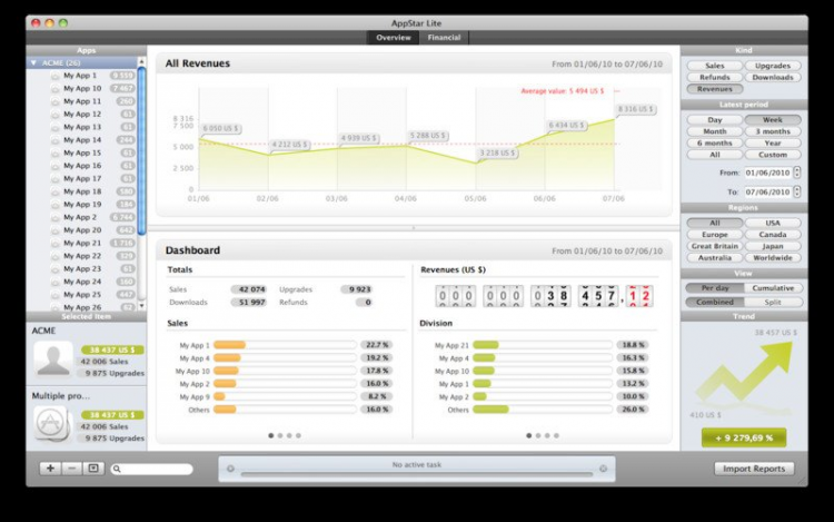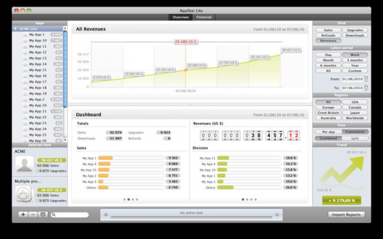 AppStar Программное обеспечение для разработчиков, которое поможет отслеживать продажи приложений для Mac, iPhone, iPad и iPod Touch. AppStar позволит просматривать информацию освоих приложениях, финансах, оценках и обзорах пользователей, а также о ваших конкуренах.