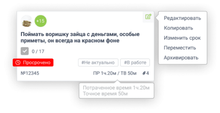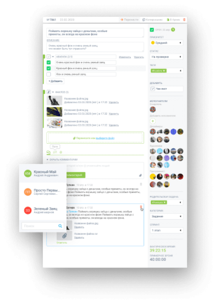 - Канбан доску, с возможностью отслеживать запланированное и фактическое время задачи, разделения работ на этапы, распределение ролей участников задач, составлять список заданий внутри задачи, прикрепления различных файлов, создание комментариев и просмотра истории прогресса/изменения задачи;