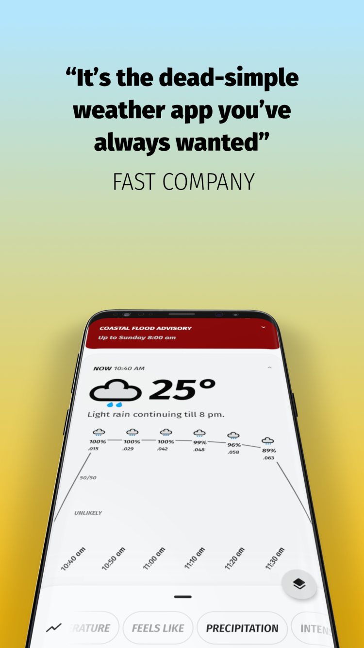 Другие полезные функции включают возможность просмотра почасовых, ежедневных и еженедельных прогнозов, с возможностью переключения между ними простым смахиванием. Последняя версия Appy Weather также содержит анимированный почасовой погодный радар, позволяющий вам видеть изменение погодных условий собственными глазами.