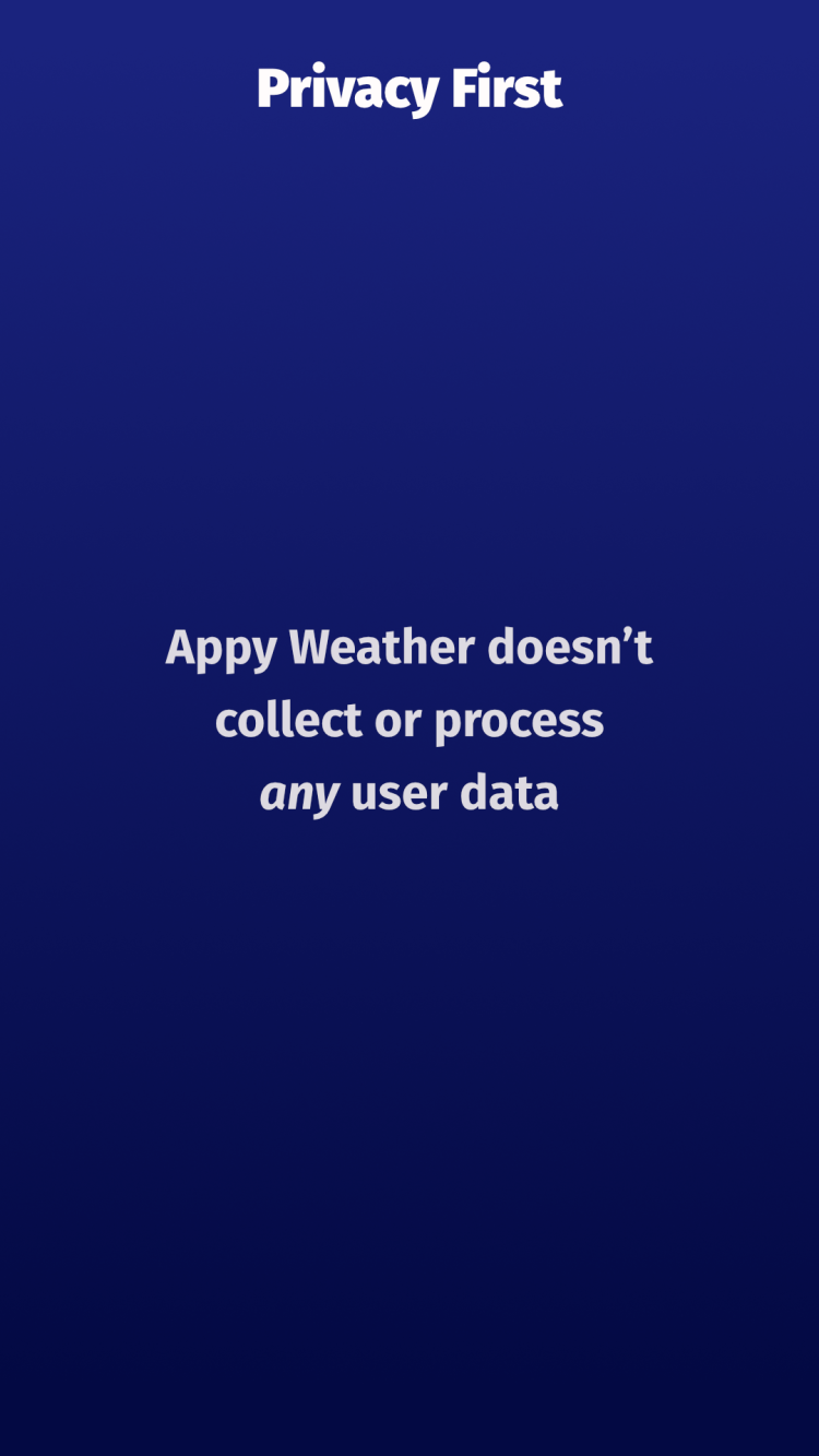 Appy Weather станет отличным решением для тех, кто устал от перегруженных лишними элементами и ненужной информацией погодных приложений. В отличие от других программ, где порой сложно найти нужные данные в обилии информации, это приложение имеет необычайно чистый и простой дизайн. Вся информация отображается таким образом, что даже беглый взгляд на экран позволяет легко прочитать информацию о температуре воздуха, осадках, влажности воздуха и т. д. Но обо всем по порядку. При первом входе в приложение вам будет предложено либо предоставить программе доступ к вашей геолокации для предоставления гиперлокальных прогнозов, либо вручную указать интересующий вас город. Какой бы вариант вы ни выбрали, разработчики настаивают на строгой защите конфиденциальности пользователей, а также на отсутствии функций сбора и обработки персональных данных.
