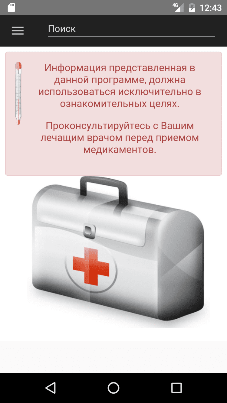 Аптечка содержит инструкции по применению лекарственных препаратов. Содержит более 6000 инструкций к различным лекарствам. Теперь нет необходимости хранить инструкции к медикаментам - они всегда под рукой в Вашем смартфоне. Информация представленная в данной программе, должна использоваться исключительно в ознакомительных целях. Проконсультируйтесь с Вашим лечащим врачом перед приемом медикаментов.