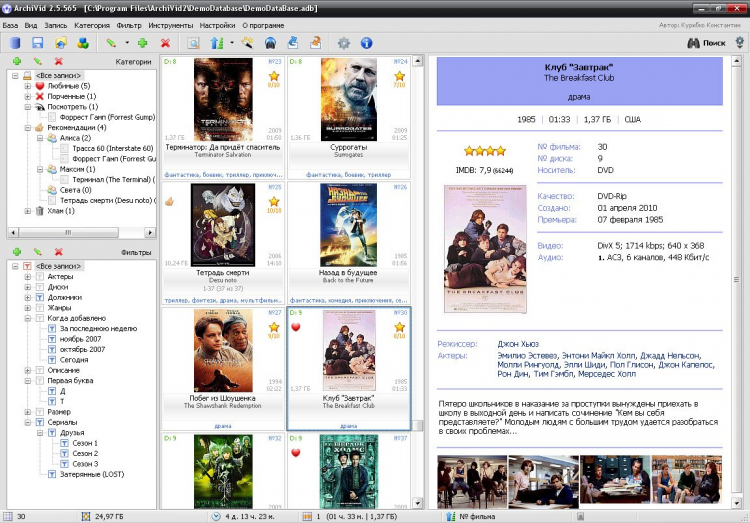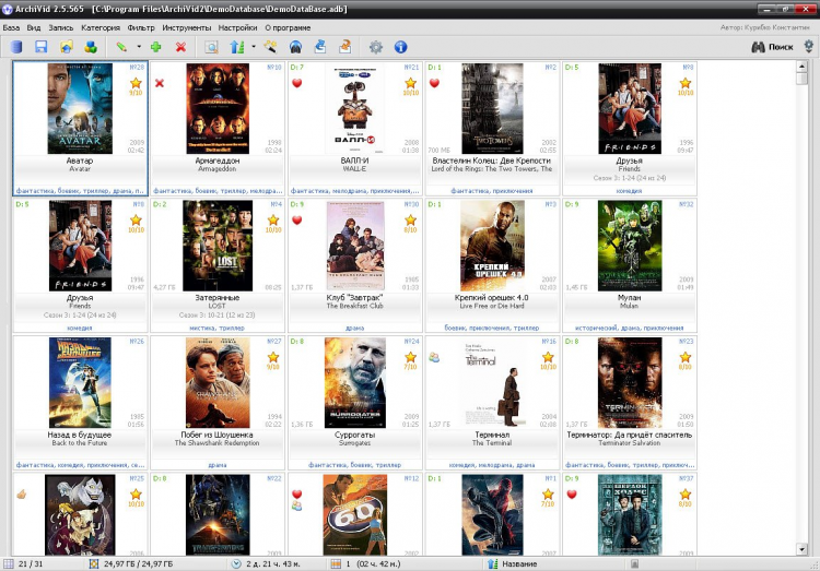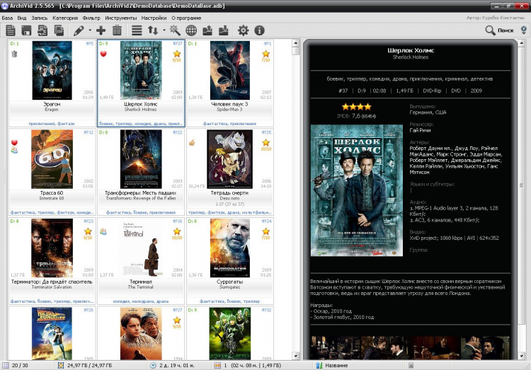ArchiVid - это удобный и мощный каталогизатор видео. Вас порадует приятный интерфейс, простое управление и множество полезных функций: поиск, сортировка, фильтрация, организация записей по категориям, поиск информации о фильме в Интернете, сканирование директории с видео-файлами, импорт, экспорт.