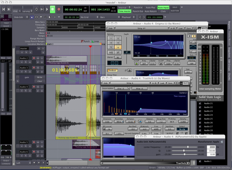 Ardour поддерживает сдвиг, подгонку, разрезание и растягивание времени записанных участков с разрешением уровня сэмплов, а также позволяет наслаивать области звуковых данных. В программу встроен гибкий редактор фейдов и инструмент распознавания темпа. Программа может сохранять историю изменений вместе с проектом, так что изменения можно отменять и возвращать при повторном открытии проекта.